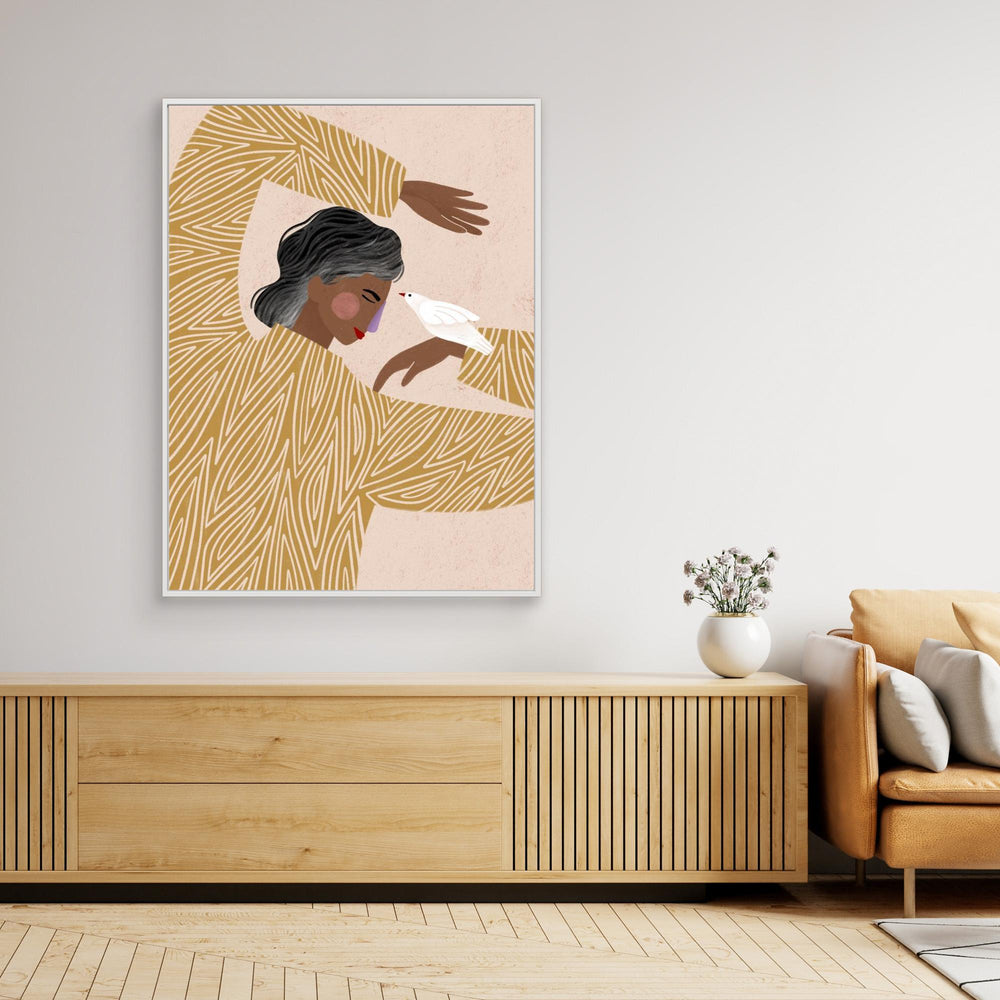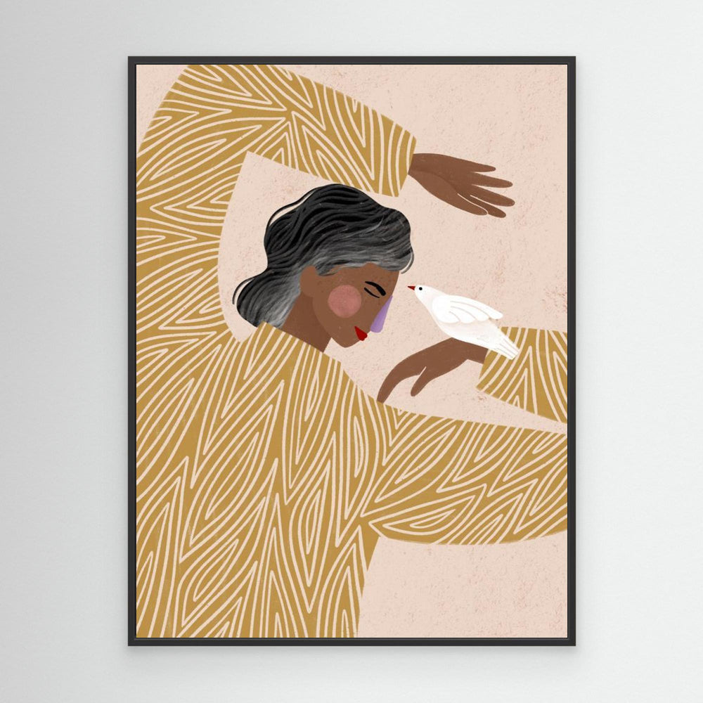 The Woman With The Bird by Bea Müller is a contemporary artwork that symbolises freedom, calm, and feminine strength. Soft, expressive forms paired with a balanced composition create a serene yet confident piece that brings depth and emotion to any space.